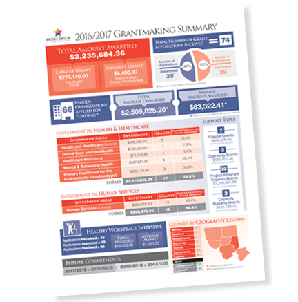 Check out our grantmaking summary for 2016/2017 that highlights total grants awarded, applications received, investment areas, support types, and geographies served. Click here.