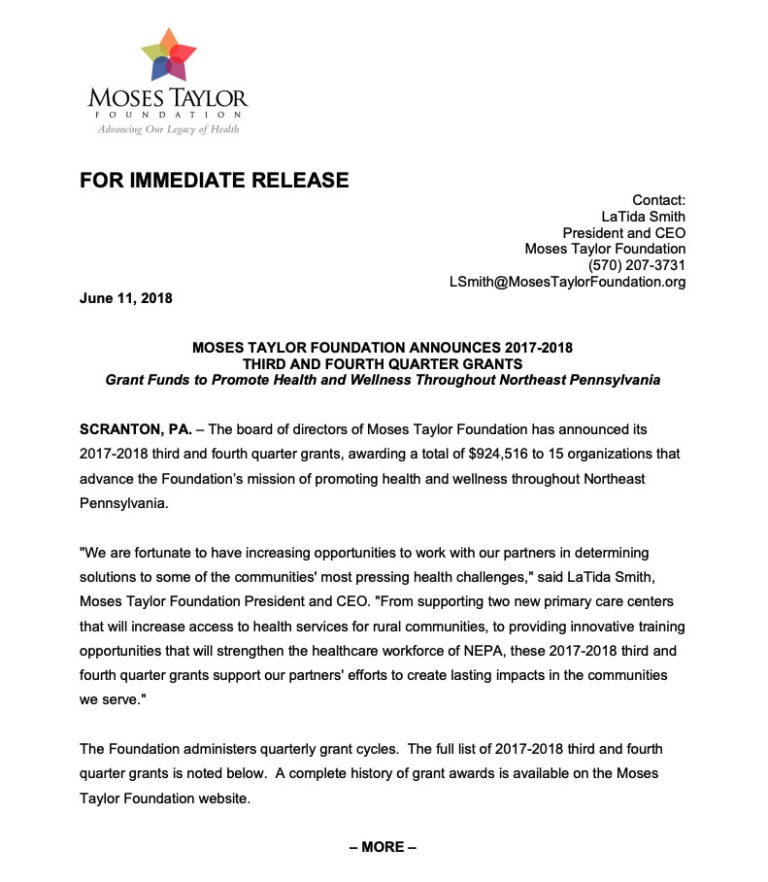 Moses Taylor Foundation has approved its 2017-2018 third and fourth quarter grants,