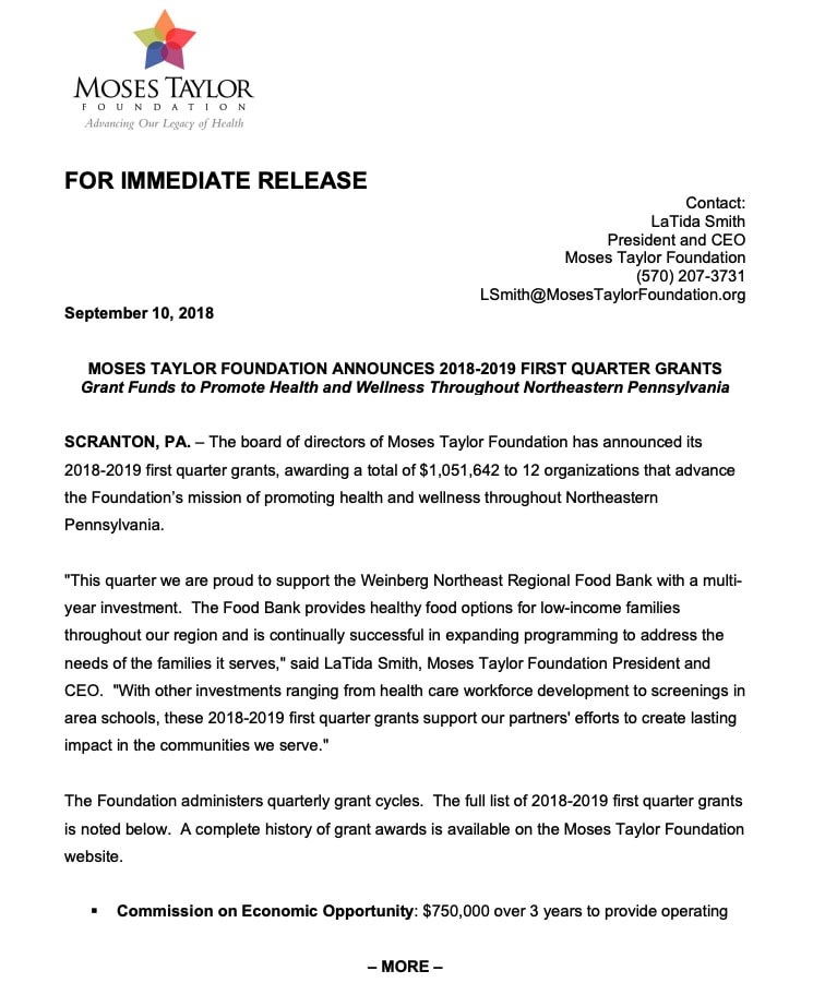 Moses Taylor Foundation has approved its 2018-2019 first quarter grants, awarding a total of $1,051,642 to 12 organizations. (Click here to read the press release)